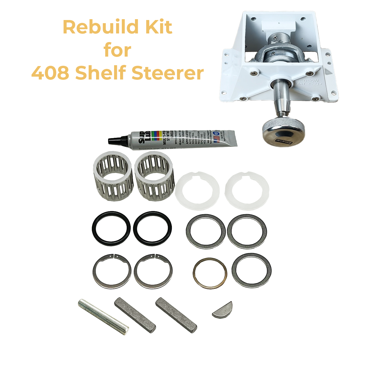 Maintain your Edson 408 Shelf Steerer with a rebuild kit that includes all the replaceable components along the wheel shaft, including needle bearings.